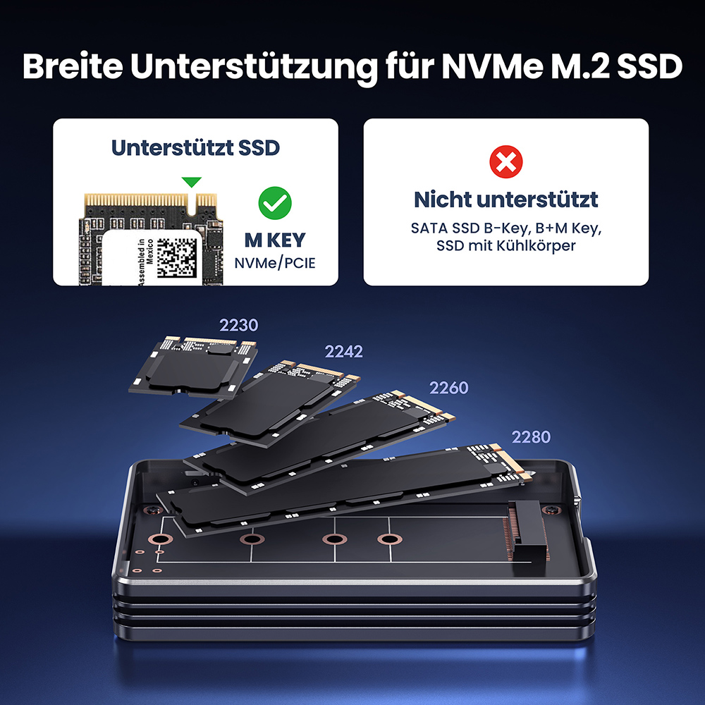 - Unterstützt M.2 NVMe SSDs M-Key 2230, 2242, 2260, 2280